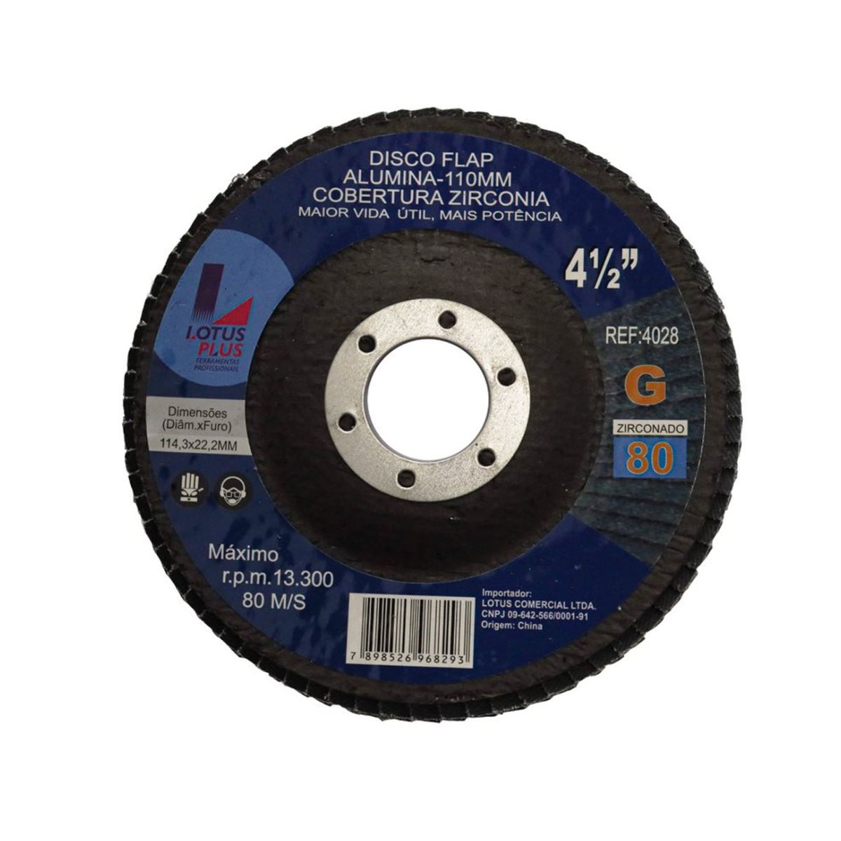 Disco de polimento (tipo Flap) 4 1/2 polegadas (Aprox. 114mm), produzido em liga de resina de poliamida e zircônia, reforçado com telas de fibra de vidro para maior segurança. Possui longa vida útil devido a alta concentração de grãos (#80), proporciona mais durabilidade e melhor acabamento. Ideal para limpeza e polimento em superfícies planas, particularmente eficiente em superfícies de aço inoxidável.